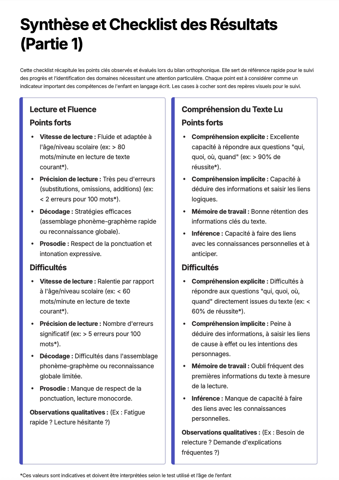 Checklist prête à cocher (Lecture, Compréhension, Orthographe, Production, Conscience phonologique, Retentissement)