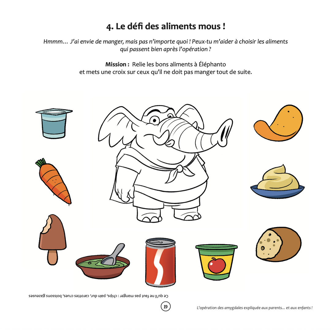 Éléphanto, un petit éléphant courageux, explique avec des mots simples pourquoi les amygdales peuvent gêner la respiration, le sommeil ou l’alimentation. L’enfant découvre le déroulement de l’intervention et avance à son rythme grâce à des défis ludiques à réaliser à la maison.
