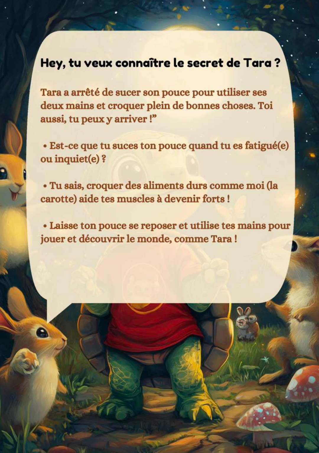 À travers l’histoire rassurante de Tara la tortue, votre enfant comprend pourquoi cette habitude peut gêner sa respiration, sa posture et le développement de sa bouche. Le livre propose des astuces concrètes (comme le défi du marqueur), des activités ludiques, des coloriages et un tableau de progression pour transformer l’arrêt du pouce en aventure motivante.