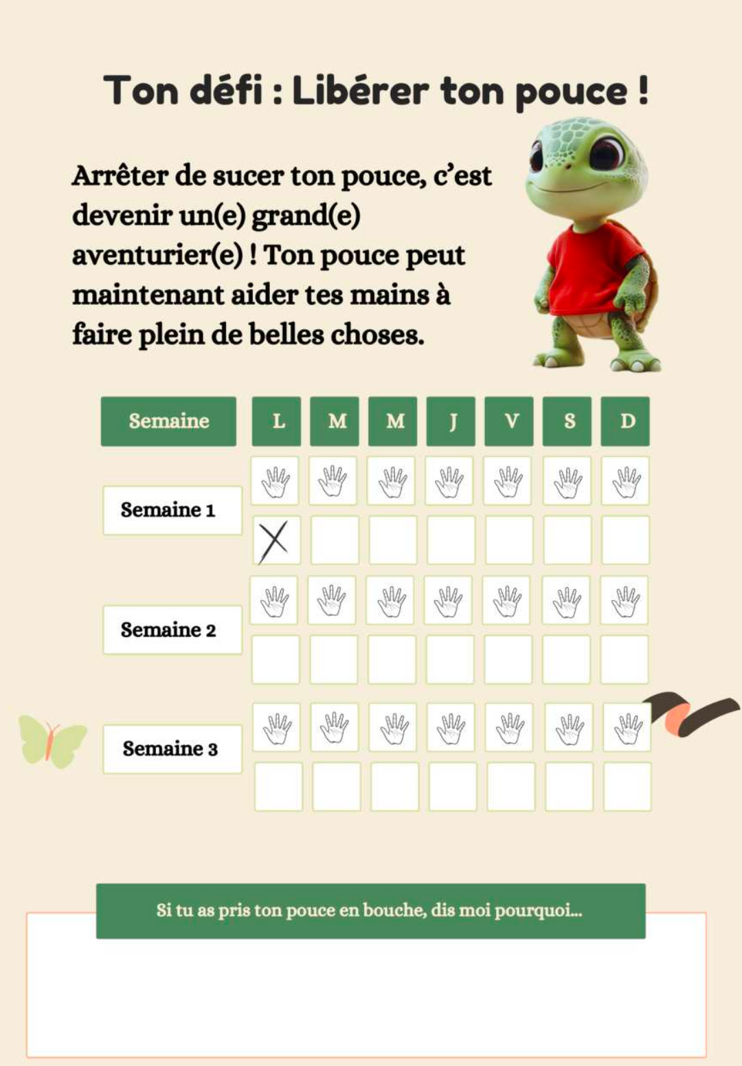Un outil clair, joyeux et rassurant pour aider votre enfant à se libérer du pouce durablement, tout en soutenant une bonne santé bucco-dentaire.