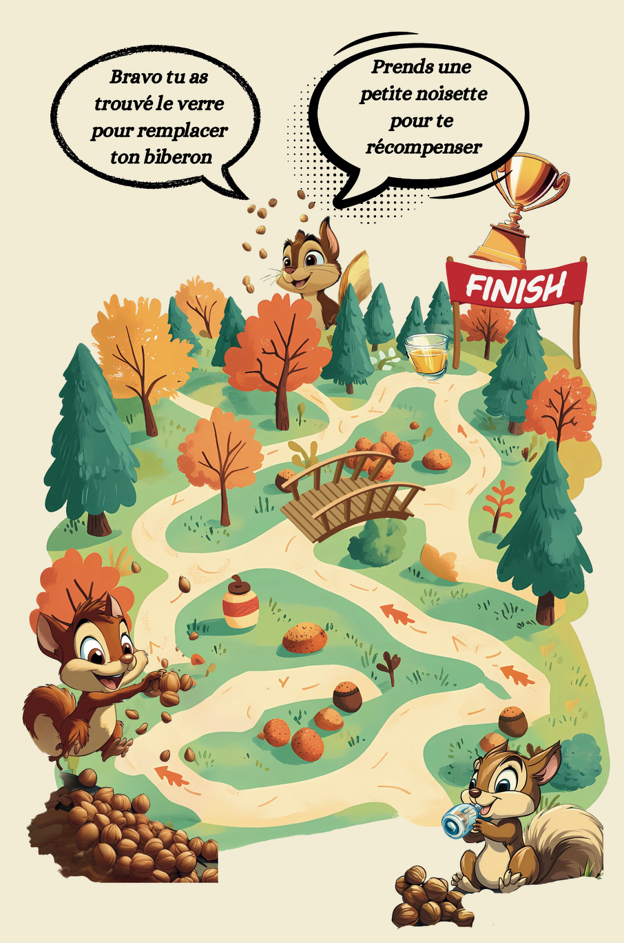 Dans ce livre, Coco et Nino : deux petits écureuils attachants, accompagnent votre enfant dans la transition vers la tasse à travers une aventure illustrée, simple et motivante. L’histoire est enrichie d’activités interactives (labyrinthes, cherche-et-trouve, jeux d’observation) qui rendent cette étape amusante et encouragent la motricité, la curiosité et l’autonomie.