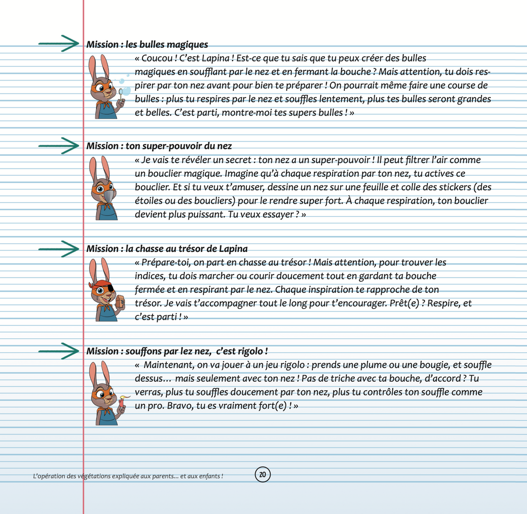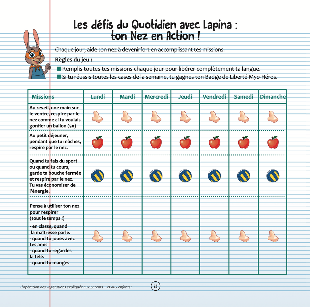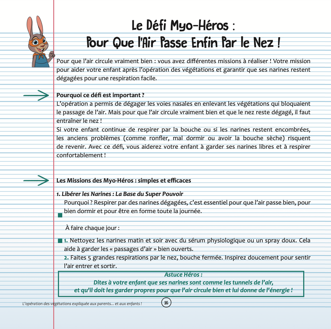 Le livre inclut Ă©galement des jeux, dĂ©fis et exercices ludiques pour rééduquer la respiration et faciliter la rĂ©cupĂ©ration, ainsi quâun outil de suivi pour encourager lâenfant jour aprĂšs jour.